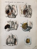 Several sections of diseased brain, numbered for key. Coloured lithograph by Batelli after Ferdinando Ferrari, c. 1843.