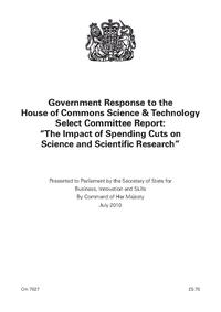 Government response to the House of Commons Science & Technology Select Committee report : the impact of spending cuts on science and scientific research / presented to Parliament by the Secretary of State for Business, Innovation and Skills by Command of Her Majesty.