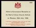 Admit to Government Reception at the Hall of Christ Church, Oxford, on Monday, 24th July, 1950.