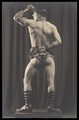 A strongman, seen from behind, wearing a fur loincloth. Photographic postcard by Hana Studios, 19--.