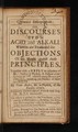 Chymical disceptations: or, Discourses upon acid and alkali. Wherein are examined the objections of Mr. Boyle against these principles. Together with a reply to a letter of Mr. S. ... wherein many errors are corrected, touching the nature of these two salts / Faithfully rendred out of French ... By J.W. To which is added, by the translator, a discourse of phlebotomy etc.