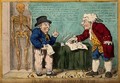 Two doctors quarreling while their patient deteriorates. Coloured engraving by I. Cruikshank, 1794.