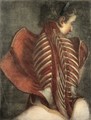 Muscles of the back: partial dissection of a seated woman, showing the bones and muscles of the back and shoulder. Colour mezzotint by J.F. Gautier d'Agoty, 1745/1746.