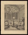 A communal house, the men sit drinking around a table while the women look after the children, weave hay and the older children cook. Engraving by C. Bouzonnet Stella after J. Stella.