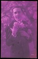 A young man holding roses, engaging the viewer. Colour photographic postcard, 1928.