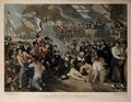 Two pairs of men fighting in combat, watched by a crowd, on the island of Lifuka, Tonga, May 1777, in honour of Captain Cook. Engraving by J. Heath, 1784, after J. Webber.