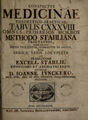 Conspectvs medicinae theoretico-practicae, tabvlis CXXXVIII omnes primarios morbos methodo Stahliana tractandos, exhibens: tertia vice editvs, correctvs et avctvs, cvm indice satis locvplete et praefatione excell. Stahlii / Avctore D. Ioanne Ivnckero.