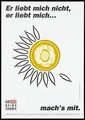 A daisy used for 'He loves me, he loves me not' game with several petals missing and a yellow condom instead of the flower's centre; representing protection against AIDS. Colour lithograph after M. Kolvenbach and G. Meyer, 199-.
