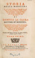 Storia della medicina in cui si vede l'origine e'l progresso di quest' arte, da secolo in secolo; le sette, che in essa si son formate; i nomi de' medici, le loro scoverte, le opinioni, e le più rilevanti circostanze della loro vita / Di Daniele Le Clerc.