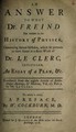 An answer to what Dr. Freind has written in his History of physick, concerning several mistakes, which he pretends to have found in a short work of Dr. Le Clerc ... / Translated from the eighth article of Bibliotheque ancienne et moderne, vol. 27 ... To which is added, a preface, by W. Cockburn.