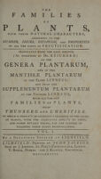 - The families of plants with their natural characters, according to the number, figure, situation, and proportion of all parts of fructification / Translated from the last ed., (as published by Dr. Reichard) of the Genera plantarum, and of the Mantissae plantarum of the elder Linneus; and from the Supplementum plantarum of the younger Linneus, with all the new families of plants from Thunberg and l'Heritier. To which is prefix'd an accented catalogue of the names of plants, with the adjectives apply'd to them, and other botanic terms, for the purpose of teaching their right pronunciation. By a Botanical Society at Lichfield [i.e. E. Darwin, etc].Linné, Carl von, 1707-1778.Date: 1787