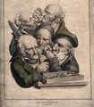 Five aged doctors crushed together in consultation. Watercolour after L. Boilly, ca. 1823.