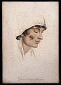 A woman with a skin disease on her face. Coloured stipple engraving by S. Tresca after Moreau-Valvile, c. 1806.