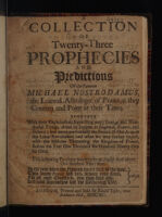 - A collection of twenty-three prophecies and predictions of the famous Michael Nostrodamus ... as they concern and point at these times / [Nostradamus].Nostradamus, 1503-1566Date: 1690