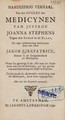 Naaukeurig verhaal van het succes der medicynen van Juffrou Joanna Stephens tegen den steen in de blaas, uit eige ondervinding beschreven ... / Waar by gevoegt is de Acte van het Parlement van Groot-Brittanje; tot het geven van een belooning aan Juffrou Stephens. Gelyk mede de authentike ontdekking van die medicynen, door haar opgegeven. Alles uit het Engelsch vertaald.