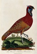 A horned Indian pheasant standing on the grass lifting its left foot. Coloured etching by J. Pass after J. E. Ihle.