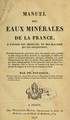 Manuel des eaux minérales de la France, a l'usage des médecins, et des maladies qui les fréquentent : contenant l'exposé des precautions qu'on doit prendre avant, pendant et après l'usage des eaux minérales; la topographie, le tableau des sources; les propriétés physiques, chimiques, médicales, et la mode d'administration des eaux; la manière d'en composer d'artificielles; une notice bibliographique; la description de sources de Spa, d'Aix-la-Chapelle, d'Aix en Savoie, de Louesche et de Saint-Gervais; précédé du rapport de la Faculté de Médicine de Paris / par Ph. Patissier.