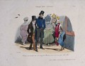 Three lecherous men gather round a pretty street seller, admiring her rather than her wares. Coloured lithograph by Langlumé after E. Pigal.