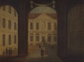 Royal College of Physicians: the courtyard, viewed through the pillars of the entrance, with gentlemen standing about. Engraving by J. Taylor after S. Wale, 1761.