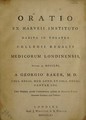 Oratio ex Harveii Instituto habita in Theatro Collegii Regalis Medicorum Londinensis, octob. 19 MDCCLXI / a Georgio Baker ... Calci orationis accedit commentarius quidam de Joanne Caio, anatomiae conditore apud nostrates.