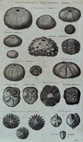 A variety of shells, including heart shells, tubuli and balani. Etching by I. Taylor.
