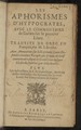 Hippocrates. Aphorisms. FrenchDate: 1605