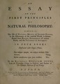 An essay on the first principles of natural philosophy. Wherein the use of natural means, or second causes, in the oeconomy of the material world, is demonstrated from reason, experiments of various kinds, and the testimony of antiquity : in four books illustrated with copper-plates / by the Reverend William Jones.