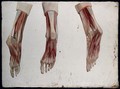 Two dissections showing the muscles of the leg. Watercolour by J.C. Zeller, ca. 1833.