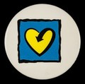 Not suitable for children under 3 years of age - sharp point present : [Terrence Higgins Trust 'heart/arrow' symbol badge : yellow heart on blue square].