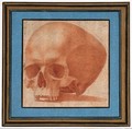 Skull, resting on a block of stone. Black chalk drawing, 18--(?).
