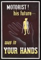 A boy walking with crutches, held in the palm of a hand, representing the responsibility of the motorist to avoid hitting pedestrians. Gouache painting by John Bonella Third, 1949.