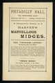 [Undated white handbill (London, December 1884?) advertising an appearance by Harvey's Midges: Princess Lottie, Prince Midge, Miss Jennie Worgen, General Tot and Mlle. Lottie Adelina de Lara, child pianist, at the Piccadilly Hall, London].
