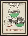 Fumes emitting from a coach, a smoker and a factory: pollution in Kenya. Colour lithograph by B. Obara/E.W. Ngunga for Ministry of Health Division of Health Education, ca. 2000.
