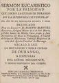 Sermon eucaristico por la felicidad que logro la Ciudad de Durango en la epidemia de viruelas del año de mil setecientos noventa y ocho / Predicado por el Licencdo. D. Joseph Manuel Esquivel ... Sácalo à luz la mui ilustre y noble ciudad de Durango, a expensas del Señor presidente, y demas individuos del cuerpo.