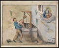 A woman who has fallen down a well being rescued by a man praying to Sansovino's Virgin and Child. Watercolour.