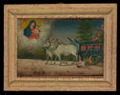 Votive picture: a boy falling under the wheel of an ox cart. Oil painting.
