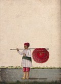 An Indian bearer holding a large, richly decorated fan or banner, horizontally on his shoulder. Watercolour by an Indian artist.
