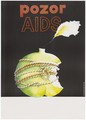 An apple that has been bitten into is tied up with a knotted rope to prevent further bites; representing precautions against AIDS. Colour lithograph after R. Vlachová, 1993.