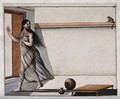 A man churning milk, whilst a sadhu (holy man) stands in front of him. Gouache painting by an Indian artist.