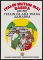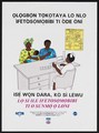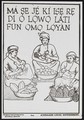 A woman points to a packet of pills: oral contraception in Nigeria. Colour lithograph by Planned Parenthood Federation of Nigeria (PPFN), ca. 2000.