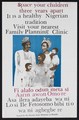 Scales bearing the weight of a large and small family: family planning in Nigeria. Colour lithograph by Health Education Unit Abeokuta, ca. 2000.