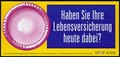 A large pink condom with a question in white lettering against a blue background asking 'have you got life-insurance today?'; German version of a series of 'Stop SIDA' [Stop AIDS] campaign posters by the Federal Office of Public Health, in collaboration with the der AIDS-Hilfe Schweiz. Colour lithograph.