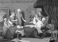 A man recuperating in bed at a receiving-house of the Royal Humane Society, after resuscitation by W. Hawes and J.C. Lettsom from near drowning. Engraving by R. Pollard, 1787, after R. Smirke.