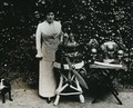 Agnes Deans Cameron, the explorer, posing with Asian and African artefacts, including a Buddha. Photograph, ca. 1911.
