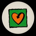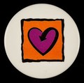 Not suitable for children under 3 years of age - sharp point present : [Terrence Higgins Trust 'heart/arrow' symbol badge : purple heart on orange square].