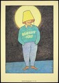 A man with a lamp shade on his head surrounded by a halo of light with the words "réveillez-vous" (Wake up!) across his jumper; representing enlightenment about AIDS. Colour silk screen print after Glen Baxter, 1993.