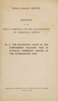 Reports of the special Committee upon the Standardization of Pathological Methods. No. 4, The diagnostic value of the complement dixation test in syphilis, commonly known as the Wasserman test.