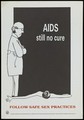 A disillusioned looking doctor holding a stethoscope looks down at his patient flattened by a large expanse of black bearing the words 'AIDS still no cure' with a reminder to practice safe sex (monotone version); an AIDS prevention advertisement by the Central Health Education Bureau in New Delhi. Colour lithograph, ca. 1991.