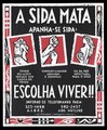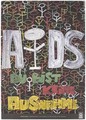 Numerous child-like drawn line figures with circles as heads in red, green, yellow and white chalk on a blackboard with the words 'AIDS du bist keine Ausnahme' [AIDS, you are no exception]; an advertisement about children with AIDS by AIDS-Hilfe Salzburg in association with the Bakip Salzburg, a private Catholic school in Salzburg. Colour lithograph by Melli Fuchs and Conny Nähn ca. 1997.