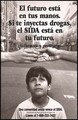 A boy looks up at two hands exchanging a packet of drugs representing a warning about the dangers of injecting drugs and contracting AIDS issued in Spanish by the New York State Health Department. Colour lithograph.
